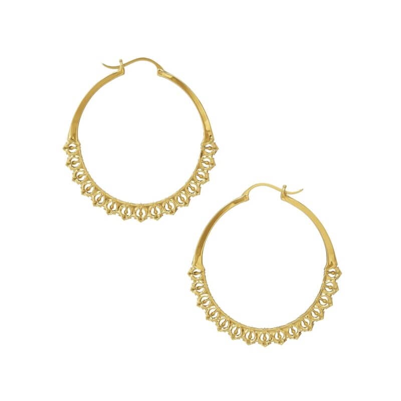 Evoke mystery and wonder with the Calla Hoops. These one-of-a-kind earrings feature a meticulously hand-sculpted motif along the lower half, designed to enthrall and captivate. Crafted for all-day comfort, these hoops offer the added surprise of being remarkably lightweight. Plated with 18k gold and cast from recycled jewelers’ brass Diameter of 2 inches Ethically made with people and the planet in mind