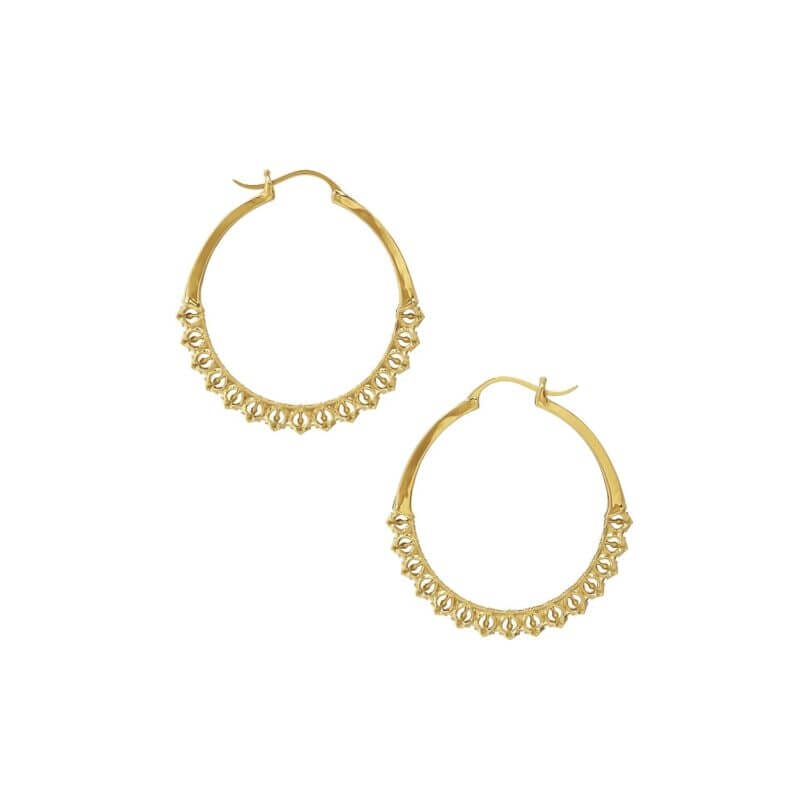Evoke mystery and wonder with the Calla Hoops. These one-of-a-kind earrings feature a meticulously hand-sculpted motif along the lower half, designed to enthrall and captivate. Crafted for all-day comfort, these hoops offer the added surprise of being remarkably lightweight. 18k gold-plated jewelers’ brass Diameter of 1.75 inches Ethically made with people and the planet in mind
