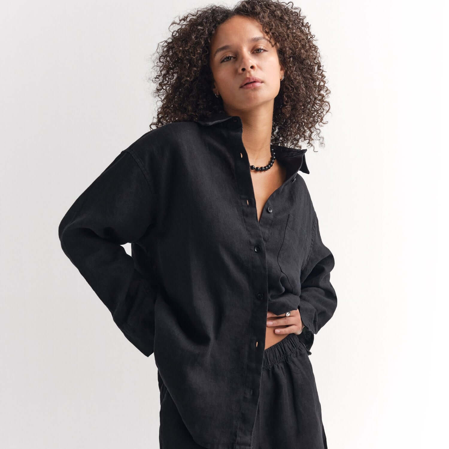 Organic Linen Oversized Button Down. Our bestselling oversized, easy fit shirt. Features button closure, shirttail hem and chest pocket. GOTS certified 100% organic linen.Made from Organic French Linen, this fabric is naturally breathable, temperature regulating, and gentle on skin. It has a lightly textured hand feel with an easy drape that softens over time, bringing comfort and ease to everyday wear. – 100% Organic Linen – GOTS Certified Organic Linen – Machine wash cold with like colors – Tumble dry low or lay flat to dry – Do not bleach- Made in IndiaPlease note that there can be slight differences in the coloration of our products across different fabrications. To ensure no color discrepancy in your set, we recommend that you opt for purchasing a set in the same fabric. – XS : Chest 47 in; Length 29.25in – S : Chest 49 in; Length 29.75 in – M : Chest 51 in; Length 30.25 in – L : Chest 53 in; Length 30.75 in – XL : Chest 56 in; Length 31.25 in