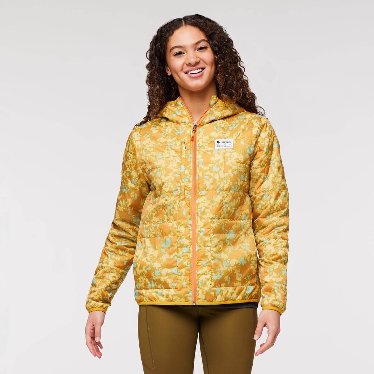 With recycled synthetic insulation and vibrant hues, the printed version of the Teca Cálido Hooded Jacket keeps your core warm and your trail style strong. Elastic binding on the hood, hem, and cuffs keeps the warmth in, while two pockets keep your hands toasty. Also available in men’s. Description This reversible, responsibly made jacket is up for a variety of adventures How it fits Regular Fit Features Reversible Water-resistant design 2 secure zippered hand pockets 2-way drop-in patch and hand pockets on the reverse side Elastic binding on collar, hem, and cuffs Packs into the chest pocket Benefits (Insulation) Warmth Warm Warmer Warmest Water Protection Limited Waterresistant Waterproof Breathability Low Moderate High Materials Shell/lining: 100% repurposed polyester taffeta with DWR finish and 600mm PU backerInsulation: 100% recycled polyester (60gsm)